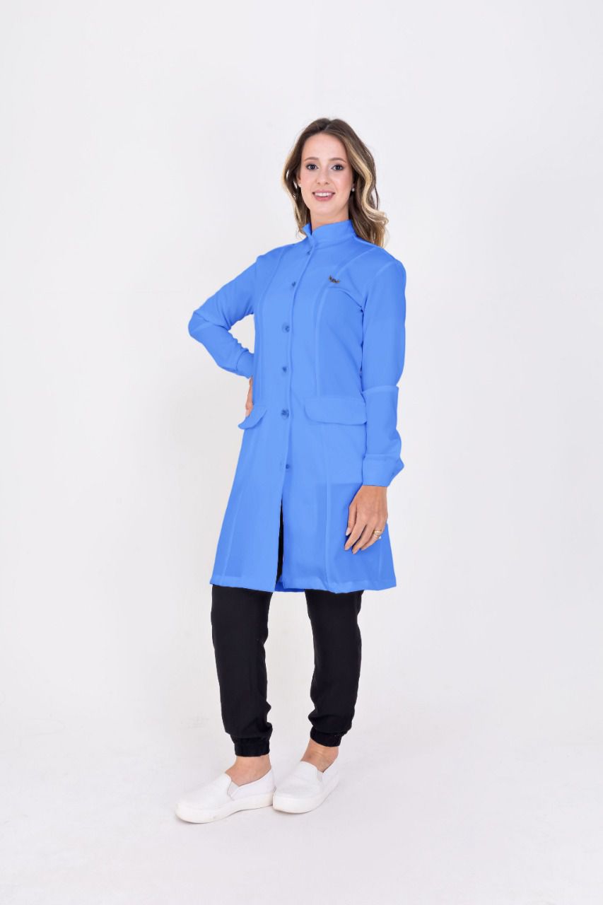 O Jaleco Londres possui gola padre transpassada e abertura funcional de botões de massa mesclados. Toda peça é pespontada com acabamentos precisos e rebatidos para evitar que a peça perca a forma.